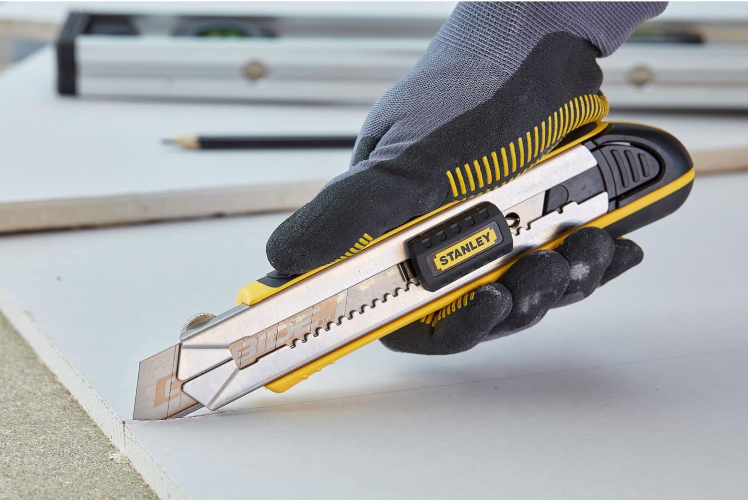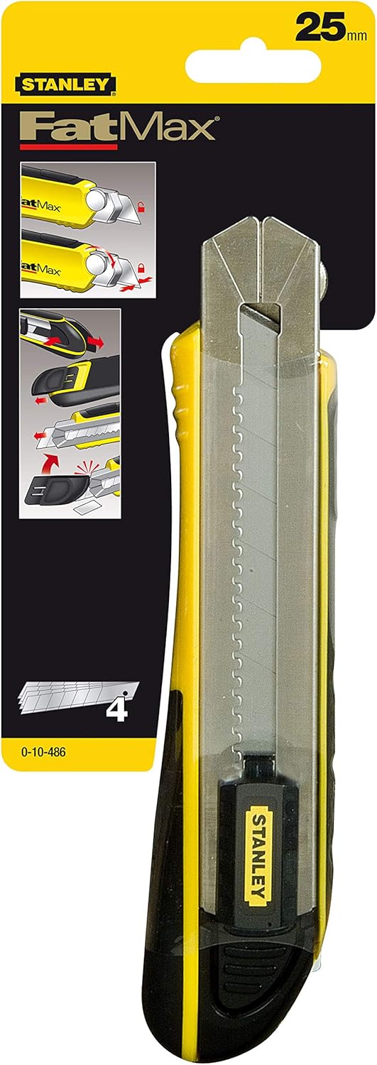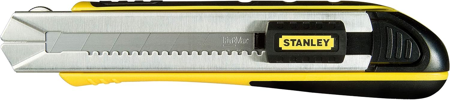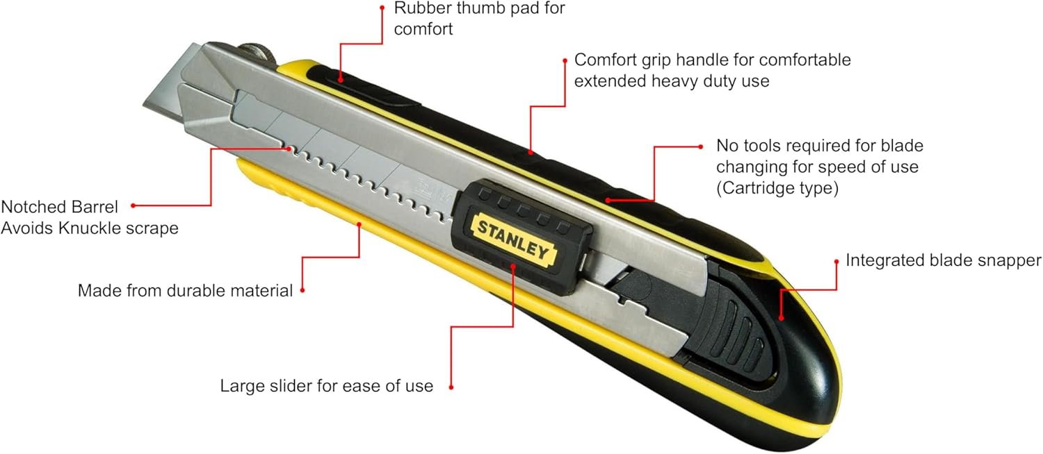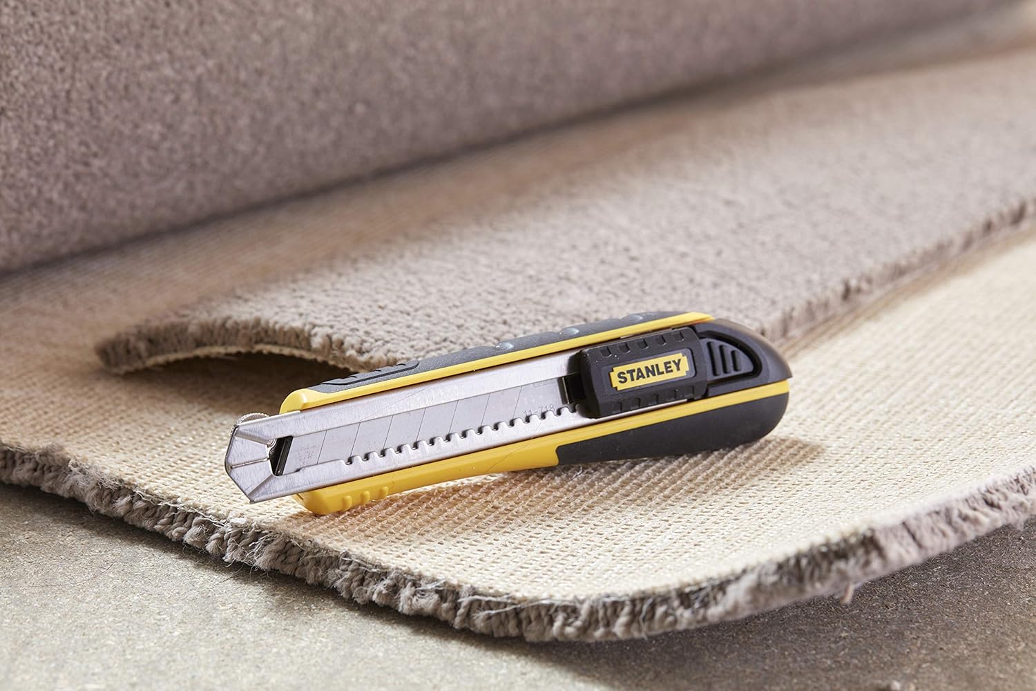 CONFORT D’UTILISATION : Corps ABS bi matière pour une bonne prise en main DOUBLE SECURITE : Avec le blocage supplémentaire par curseur pour un maintien parfait de la lame DURABILITE : Chariot de lame en acier inoxydable, longévité et guidage parfait de la lame CASSE-LAMES INTEGRE: Pour casser les lames de manière sûre et efficace; cartouche de 6 lames à rechargement automatique FOURNI AVEC : 6 lames de cutter 18 mm STANLEY FATMAX